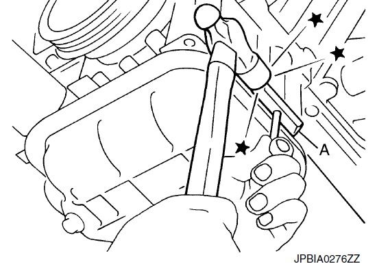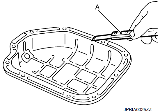 - b. Вставьте резак для уплотнения [SST: KV10111100 (J-37228)] (A) между масляным поддоном (верхним) и масляным поддоном (нижним).