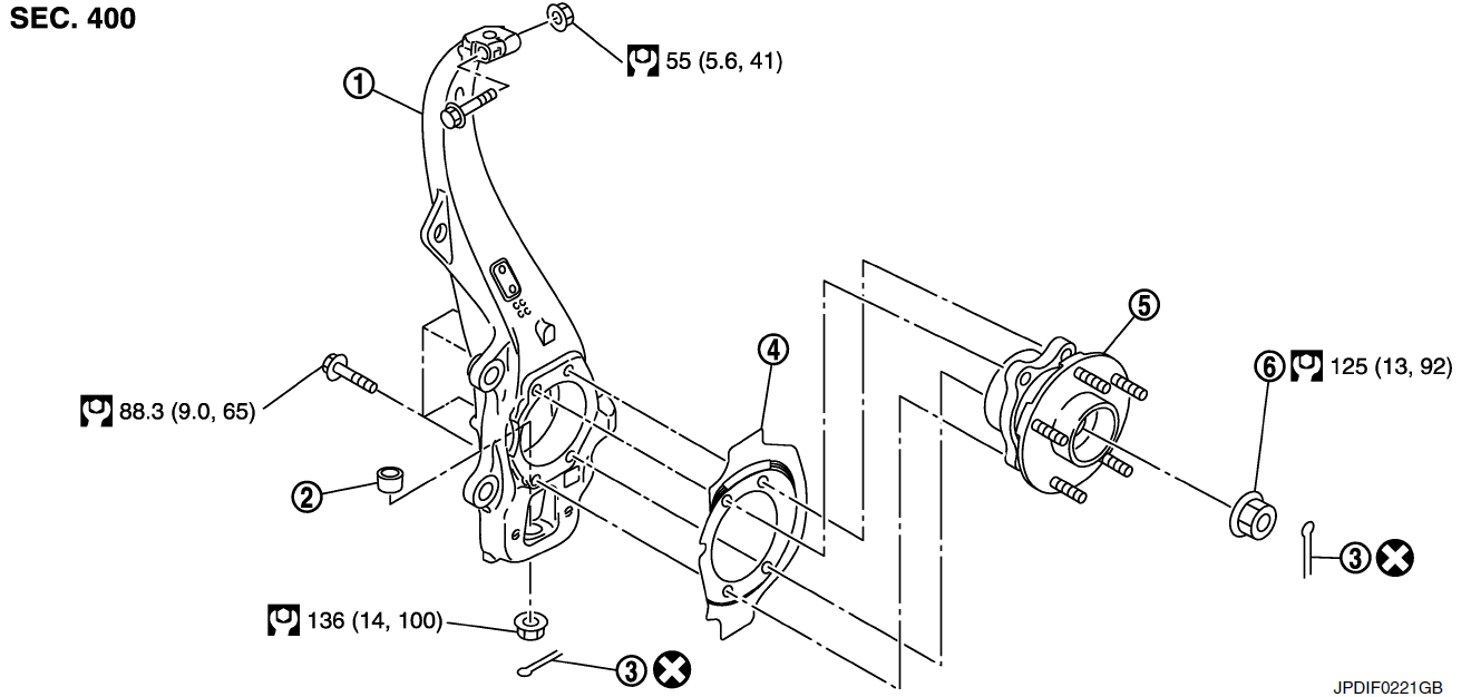 Передняя ступица на INFINITI EX первого поколения представляет собой неразборный узел в сборе (Hub Assembly), объединяющий собственно ступицу и запрессованный подшипник. В конструкции также интегрирован датчик ABS (скорости вращения колеса). Замена производится только в сборе, так как подшипник запрессован и отдельно не меняется.