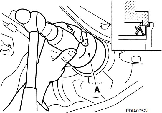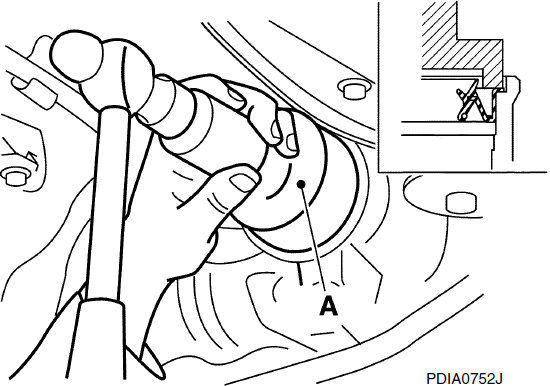 - 2. Установите переднее сальниковое уплотнение, используя выступ (A) [SST: ST30720000 (J-25405)], как показано на рисунке.
