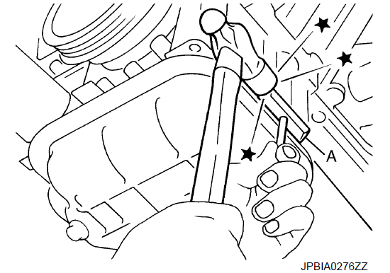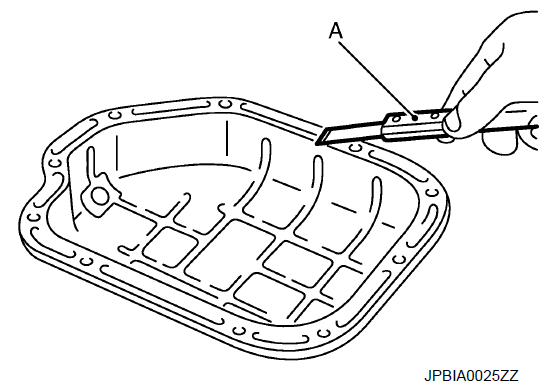 - b. Вставьте резак для уплотнения [SST: KV10111100 (J-37228)] (A) между масляным поддоном (верхним) и масляным поддоном (нижним).
