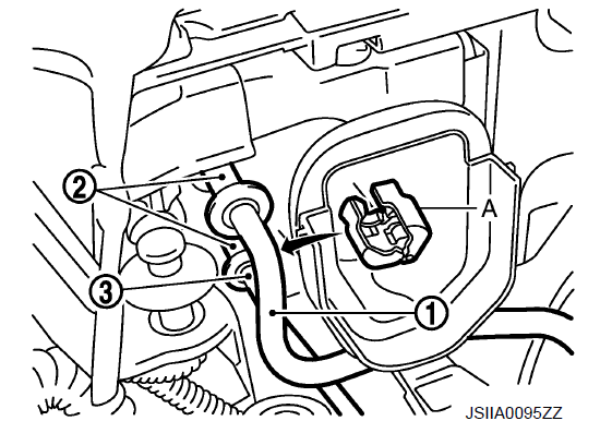 - 4. Отсоедините одним касанием соединение между гибким шлангом высокого давления (1) и трубой конденсатора в сборе (2) с помощью разъединителя (A) (SST: J-45815).
