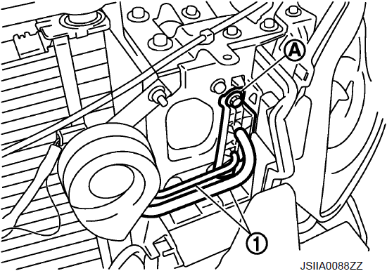 - 6. Выверните крепежный болт (А) из узла труб конденсатора (1).