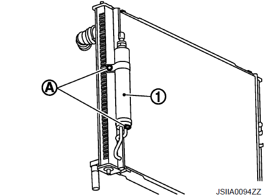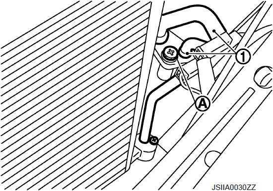 - 7. Выверните крепежный болт (А) из узла труб конденсатора (1).