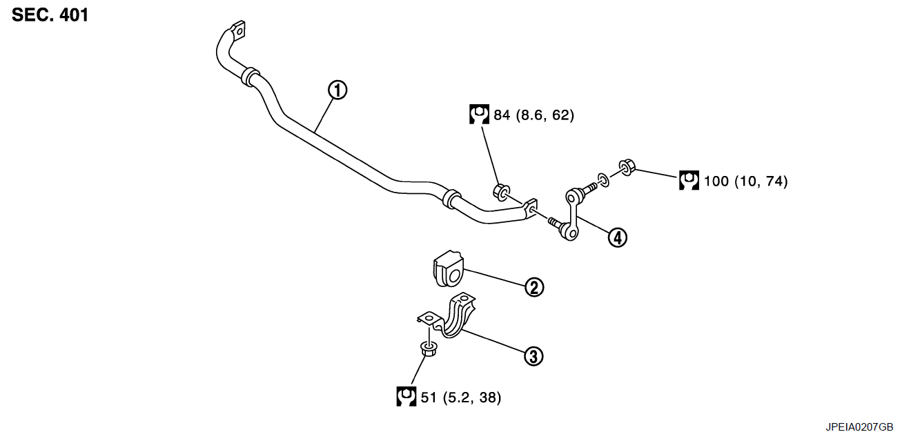 На INFINITI M37 (с двигателем VQ37VHR) передний стабилизатор крепится к подрамнику с помощью двух резиновых втулок, которые фиксируются металлическими скобами (хомутами). Оригинальные номера втулок стабилизатора для данной модели – 54613-1CA0A (диаметр стабилизатора 28 мм) или 54613-1CA0B (диаметр 26 мм). Необходимо уточнять диаметр стабилизатора перед заказом запчастей. Момент затяжки болтов крепления скоб составляет 45–55 Н·м. Важно использовать новые болты (если предусмотрено регламентом) и наносить специальную смазку на внутреннюю поверхность втулки для предотвращения скрипов.