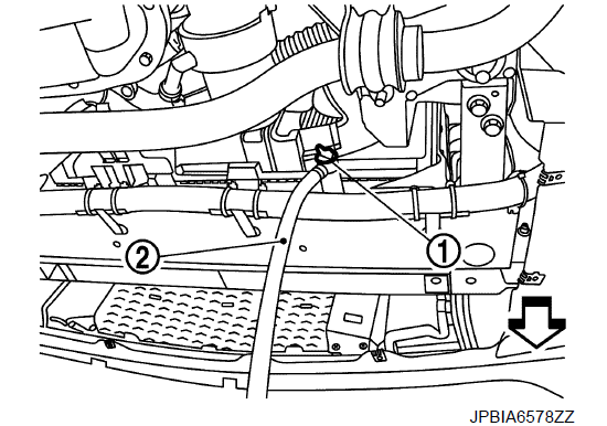- 4. При необходимости снимите бачок-накопитель, слейте охлаждающую жидкость из двигателя и очистите бачок-накопитель перед установкой. (ПРИ ИСПОЛЬЗОВАНИИ БАЧКА-НАКОПИТЕЛЯ РАДИАТОРА БЕЗ ДАВЛЕНИЯ)