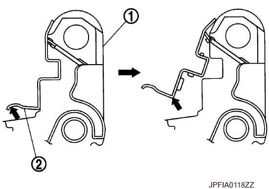 - Снимите возвратные пружины накладки 1 с фиксатора накладки 2.