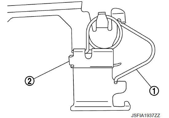 - 1. Установите возвратные пружины накладки 1 на фиксатор накладки (верхняя сторона) 2, если возвратные пружины накладки были сняты.