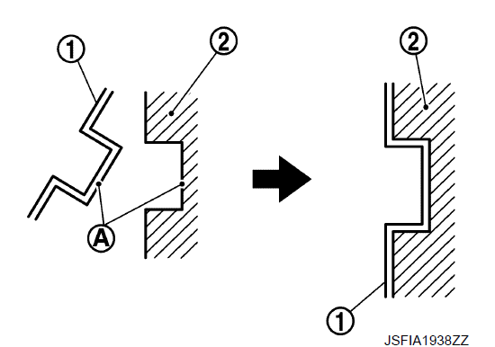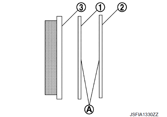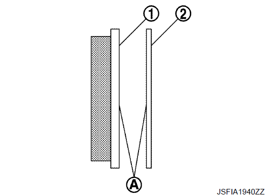 - 2. Нанесите MOLYKOTE® 7439 или аналогичный материал на поверхность стыка A между фиксаторами прокладок 1 и элементом колодки 2, если они были сняты. 3. Установите фиксатор накладки (верхняя сторона с возвратной пружиной накладки) на вращающий элемент, если фиксаторы накладки были сняты.