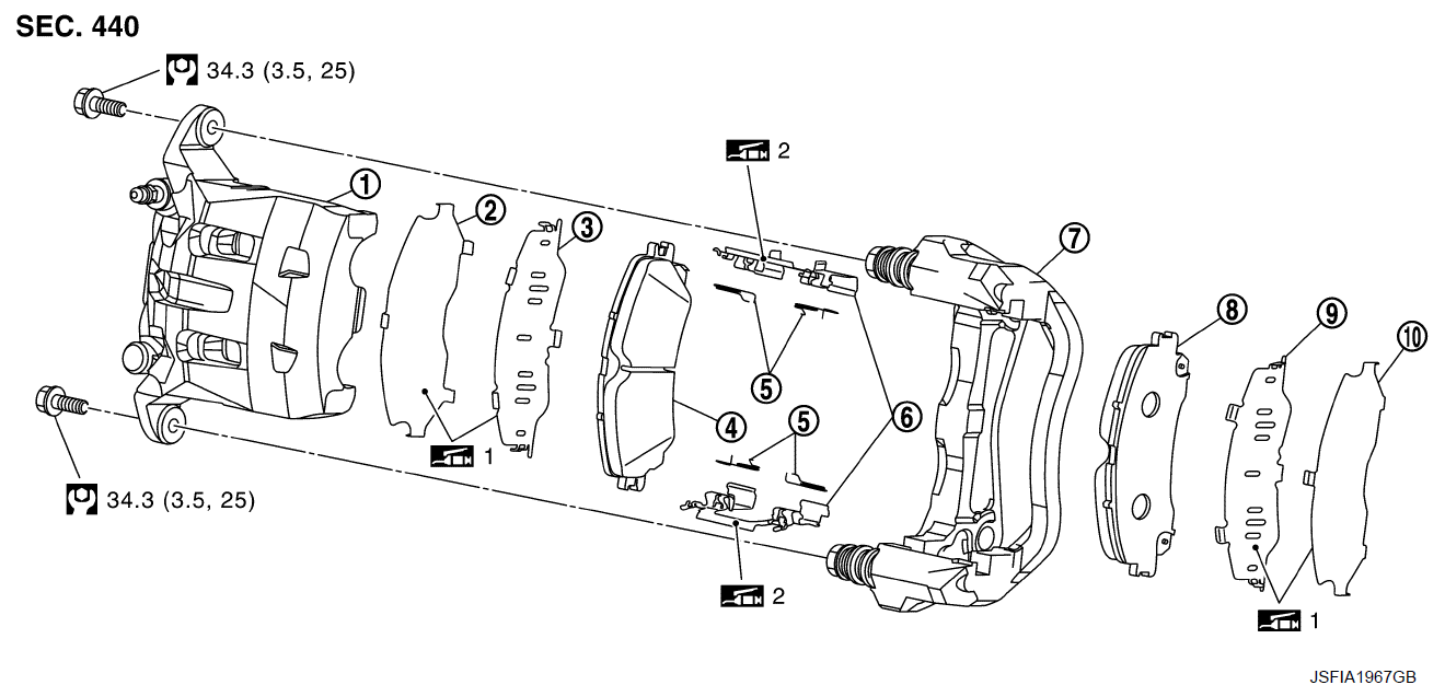 - 3. Нанесите MOLYKOTE® 7439 или аналогичный состав на соответствующие поверхности между тормозной колодкой 1 и фиксатором колодки и установите тормозную колодку в суппорт.