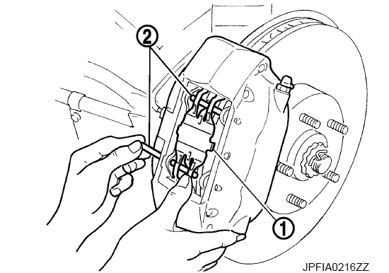 - 3. Закрепите корпус цилиндра проволокой, чтобы тормозной шланг не растягивался. Снимите тормозные колодки, колодки, крышка колодки и фиксаторы накладок с тормозного диска.