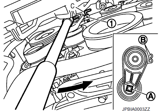 - 2. Надежно удерживая квадратное отверстие А в центре шкива автоматического натяжителя 1 рукояткой вращателя, переместите рукоятку вращателя в направлении, указанном стрелкой (направление ослабления приводного ремня).