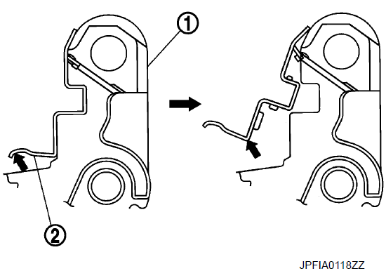 - 5. Наденьте верхнюю часть поперечной пружины на верхний штифт накладки, вдавите поперечную пружину, установите нижний штифт накладки с внутренней стороны на внешнюю и закрепите поперечную пружину.