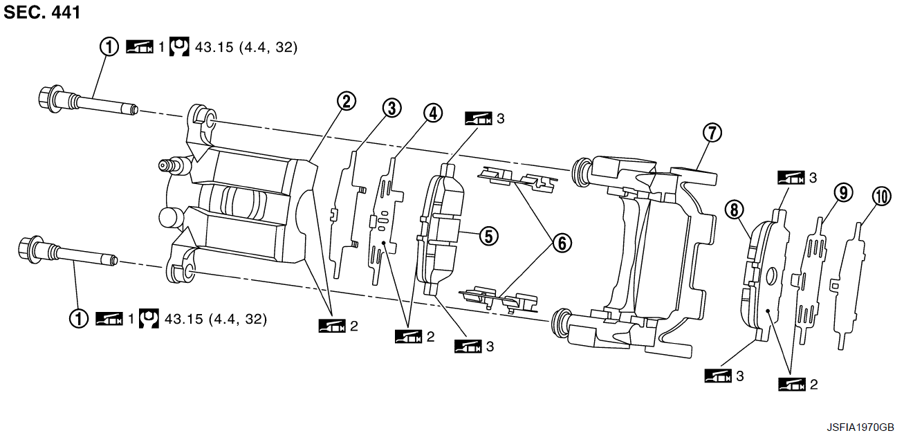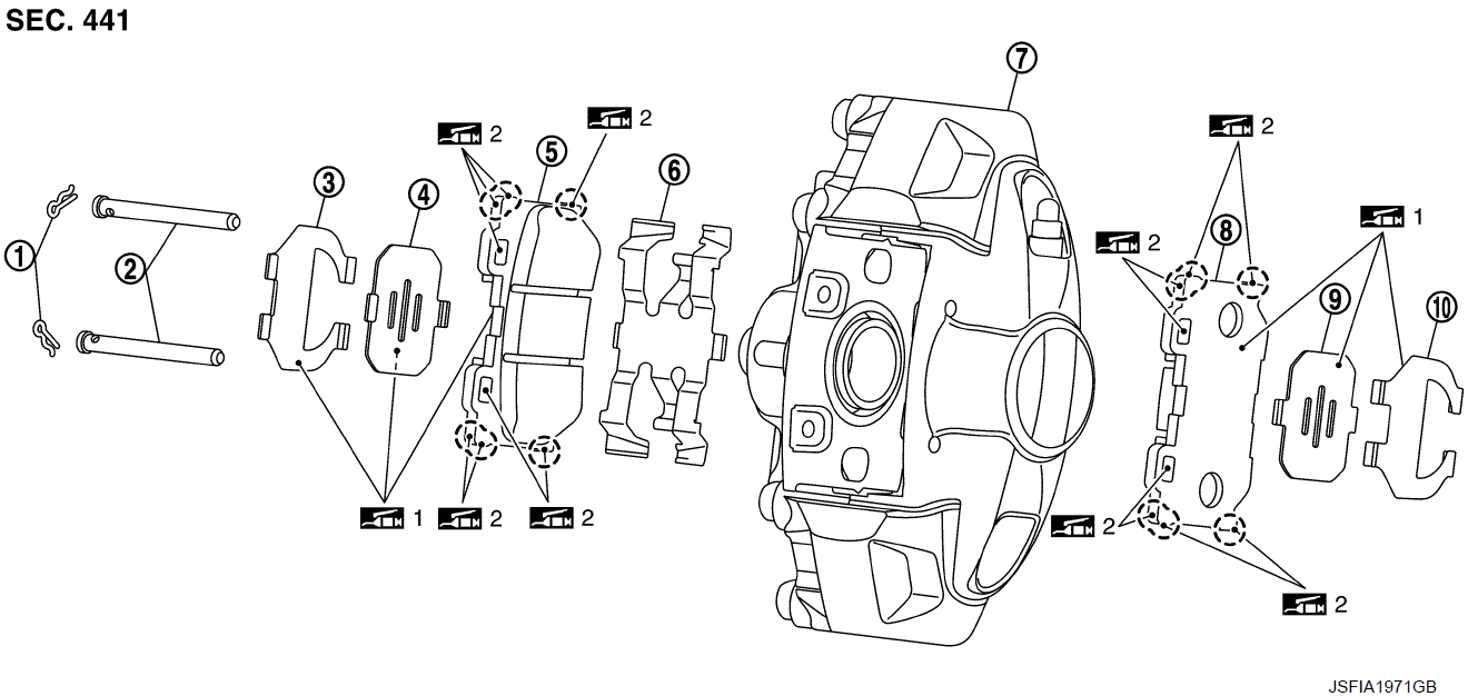 - 3. Нанесите MOLYKOTE® 7439 или equilavent на контактные поверхности между тормозными колодками и штифтами колодок.
