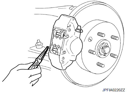 - Закрепите корпус цилиндра проволокой, чтобы тормозной шланг не растягивался. Снимите тормозные колодки, колодки, крышка колодки и фиксаторы накладок с тормозного диска.