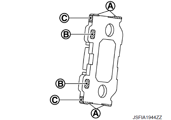 - 1. Нанесите смазку MOLYKOTE® AS880N или смазку на силиконовой основе на стыки между тормозными колодками, прокладками