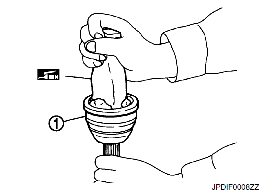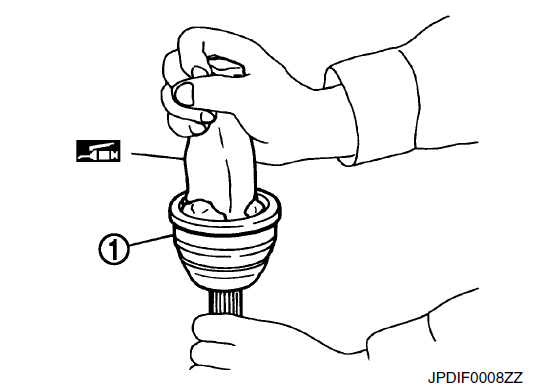 - 2. Заполните узел соединения с зазубренным пазом (1) смазкой NISSAN original или аналогичной консистентной смазкой до тех пор, пока зазубренный паз и шариковая канавка не заполнятся до краев.