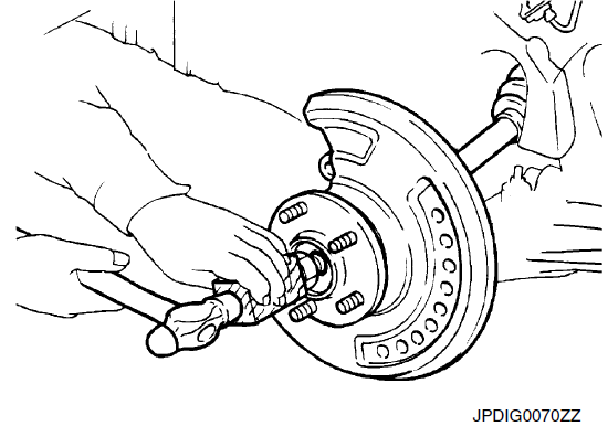 - 13. Вставьте приводной вал в ступицу колеса и подшипниковый узел, а затем временно затяните контргайку ступицы колеса.