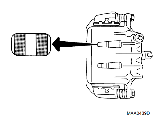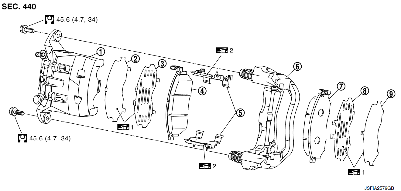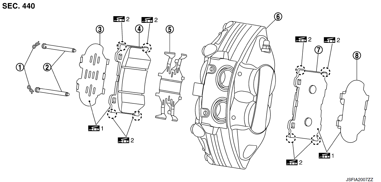 - 2. Нанесите MOLYKOTE® 7439 или аналогичный материал на стыки между тормозными колодками и суппортом.