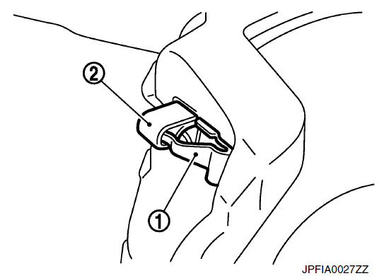 - 5. Наденьте верхнюю часть поперечной пружины (1) на верхний штифт накладки (2), вдавите поперечную пружину, установите нижний штифт накладки с внутренней стороны на внешнюю и закрепите поперечную пружину.