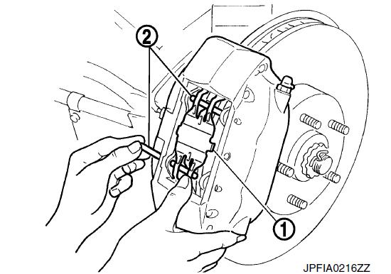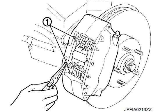 - 3. Снимите штифты накладки, удерживая поперечную пружину нажатой, затем снимите поперечную пружину с суппорта.