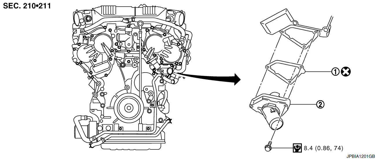 - 9. Снимите водозаборник и термостат в сборе(1).