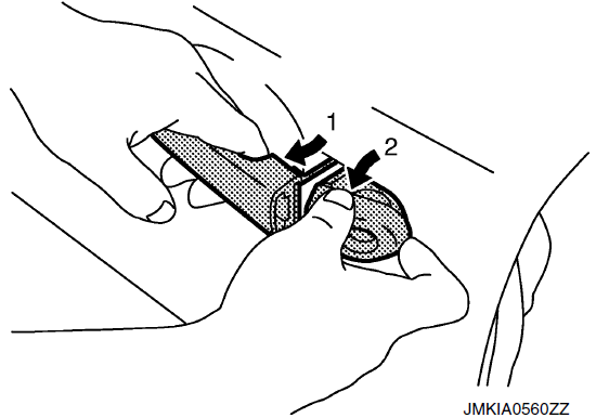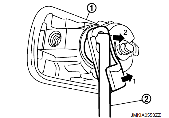 - 6. Дотянуться до разъемного соединения стержня ключа (2) [на цилиндре замка двери в сборе (1)] (со стороны водителя).