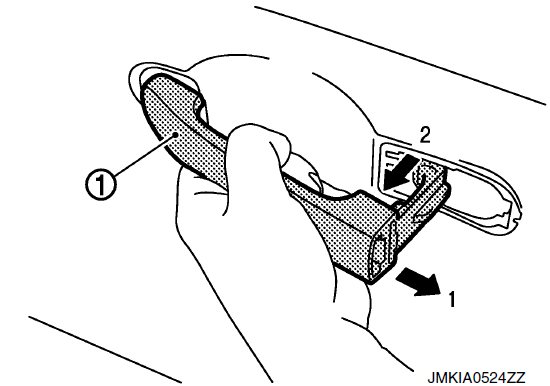 - 8. Потянув за наружную ручку (1), сдвиньте ее в сторону задней части автомобиля, чтобы снять наружную ручку.