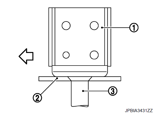 - Поднимите и потяните радиатор (1) вперед, а затем снимите монтажную резинку (нижнюю) (3) с опоры сердечника радиатора (2).