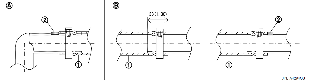 Вставьте шланг радиатора (1) до упора (2) или на 33 мм (1,30 дюйма) (шланг без пробки).
