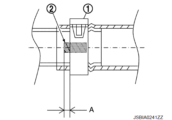 Чтобы установить хомуты для шланга (1), убедитесь, что расстояние (А) от конца отметки краски (2) на шланге радиатора до хомута для шланга находится в пределах контрольного значения.
