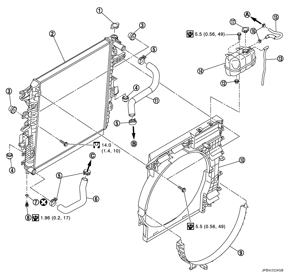 | Шланг радиатора (нижний) | Сторона радиатора | Нижняя | C |