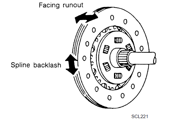 Измерьте окружное биение относительно центрального шлица диска сцепления. Если оно не соответствует спецификации, замените диск сцепления.