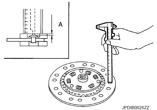 Измерьте штангенциркулем глубину “А” от диска сцепления до головок заклепок. Если она превышает допустимый предел износа, замените диск сцепления.