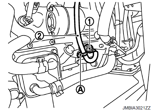 - 11. Снимите фиксатор жгута проводов (A) с масляного поддона (верхний), а затем переместите жгут проводов (2) в такое место, где они не будут мешать работе.