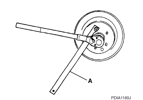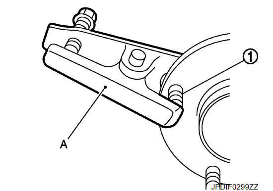 - 14. Выверните болты ступицы (1) из ступицы колеса в сборе, используя приспособление для снятия шаровых шарниров (A) (инструмент для коммерческого обслуживания).