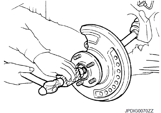 - 7. Закрепите контргайку ступицы колеса куском дерева. Ударьте молотком по дереву, чтобы отсоединить ступицу колеса в сборе от приводного вала.