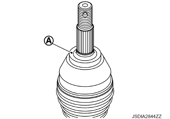 Очистите соответствующую поверхность приводного вала, ступицы колеса в сборе. Затем нанесите пасту [сервисные детали (440037S000)] на поверхность (А) узла соединения приводного вала.