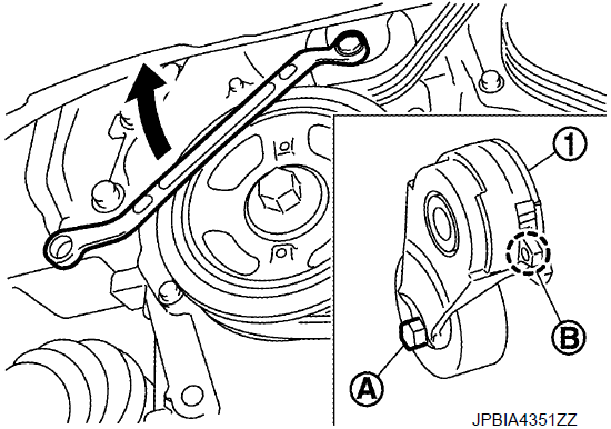 - 4. Вставьте стержень диаметром примерно 6 мм (0,24 дюйма), такой как вставьте короткую отвертку в отверстие (B) стопорного выступа, чтобы закрепить устройство автоматического натяжения приводного ремня.