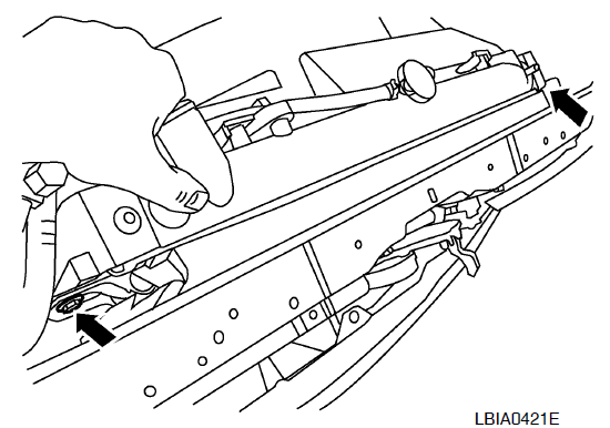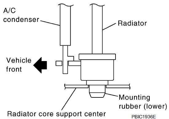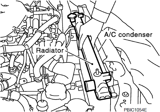 ОСТОРОЖНО: Поскольку конденсатор кондиционера прикреплен к передней нижней части радиатора, его перемещение в заднем направлении должно быть минимальным.
