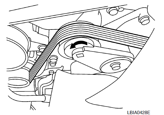 - 2. Поверните автоматический натяжитель приводного ремня в направлении, указанном стрелкой (направление ослабления натяжителя), как показано на рисунке, используя подходящий инструмент.