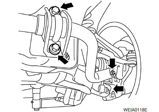 - 3. Ослабьте верхние болты крепления кронштейнов стабилизатора поперечной устойчивости, затем снимите нижние болты крепления кронштейнов и снимите стабилизатор поперечной устойчивости.