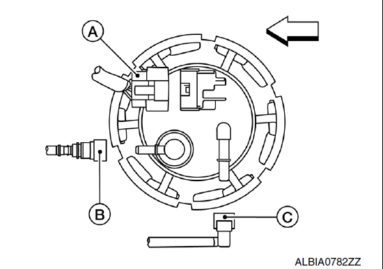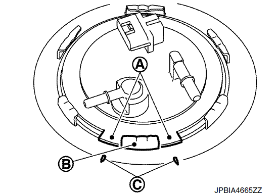 - Перед снятием проверьте соответствие между выступами датчика уровня топлива, топливного фильтра и топливного насоса в сборе (A) и соответствующими метками (C) на топливном баке, как показано на рисунке. Это соответствие необходимо для правильной установки.