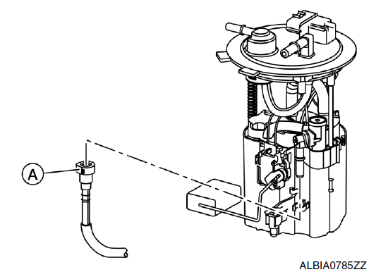 - 12. Поднимите датчик уровня топлива, топливный фильтр и топливный насос в сборе достаточно высоко, чтобы получить доступ к соединителю передаточной трубки (A) и отсоединить его.
