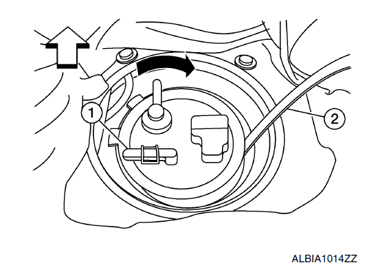 - d. Установив блок датчика уровня топлива, топливный фильтр и топливный насос в сборе в бак, поверните его на 1/4 оборота по часовой стрелке так, чтобы трубка подачи топлива (1) была направлена в сторону водителя.