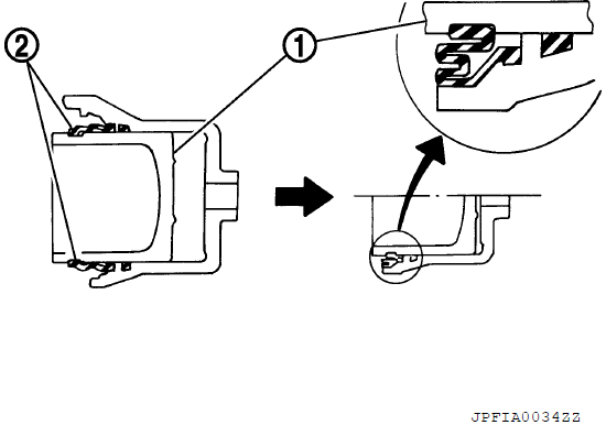 - 4. Нанесите тормозную жидкость на каждый поршень (1). Вручную вдавите каждый поршень в корпус цилиндра и вдавите бортик поршня (2) со стороны поршня в канавку поршня.