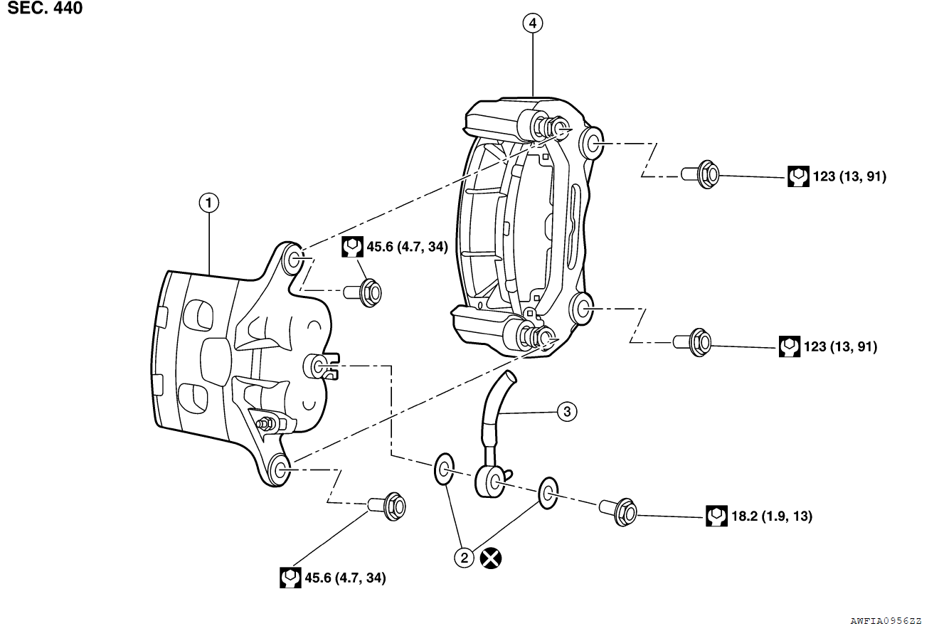 Нет необходимости откручивать болты на динамометрическом элементе и тормозном шланге, за исключением разборки или замены тормозного суппорта. При снятии тормозных колодок закрепите тормозной суппорт проволокой, чтобы не растягивать тормозной шланг.