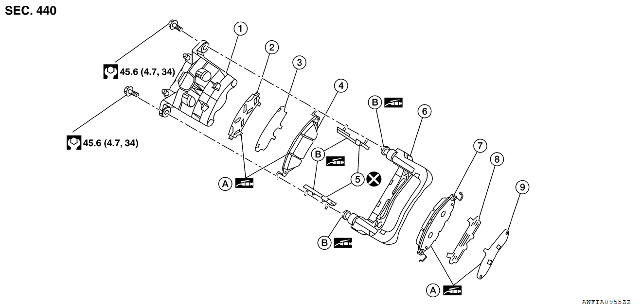 Проверьте скользящие штифты и накладки для скользящего штифта на наличие ржавчины, износа, трещин или повреждений. При обнаружении каких-либо неисправностей замените детали.
